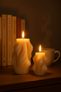 Zweiteiliges Skulpturkerzen-Set in cremeweiß, handgegossen aus Bio-Sojawachs. In organischer Wellenform – stilvoll, vegan & perfekt als Deko oder Geschenk.