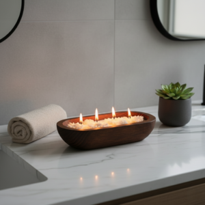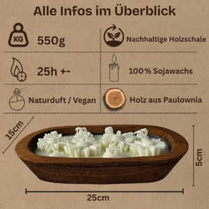 - Wiederverwendbare Schale: Nach dem Abbrennen der Kerze bleibt dir eine hochwertige Holzschale, die du kreativ weiterverwenden kannst – zum Beispiel als Dekoschale, für Trockenobst, Nüsse, Schmuck oder als Basis für eine neue Kerze.